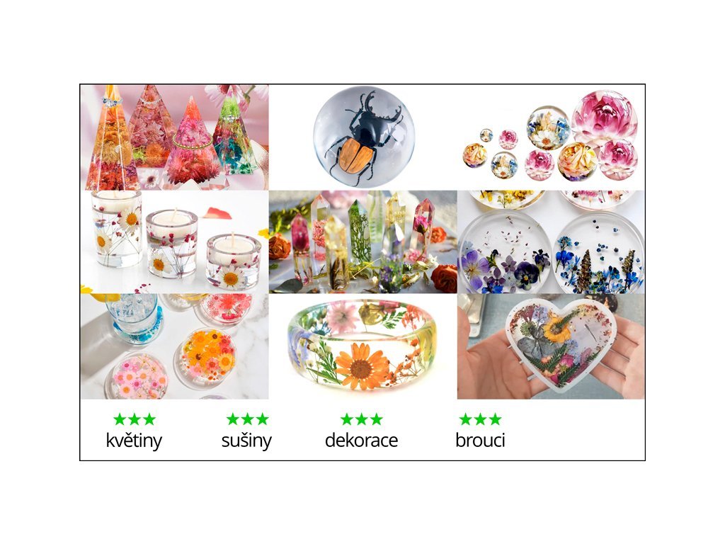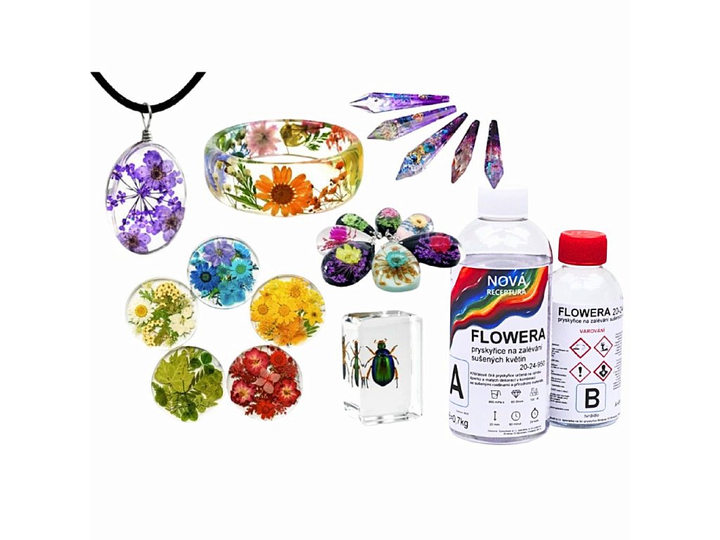 FLOWERA je krištáľovo číra epoxidová živica určená na zalievanie sušených kvetov, výrobu šperkov a malách dekorácií v kombinácii so sušenými rastlinami a prírodnými materiálmi.