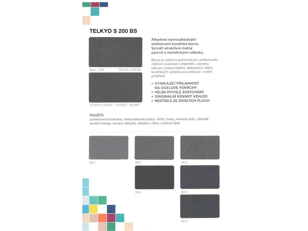 Farba je určená k jednovrstvovým antikoróznym náterom ocele, najmä pre vysoko efektné, dekoratívne nátery kováčskych výrobkov pre vonkajšie aj vnútorné prostredie. V prípade očakávanej vyššej koróznej agresivity odporúčame použiť vhodný základný náter, napr. TELPOX P 170. Náterový film vytvára atraktívny matný povrch s kovovými odleskami. Pred použitím sa farba premieša, zmieša s tužidlom v predpísanom pomere, dôkladne premieša a do riedi podľa potreby. Konečných vlastností dosiahne náter po úplnom vyzretí, čo predstavuje cca 7 dní.